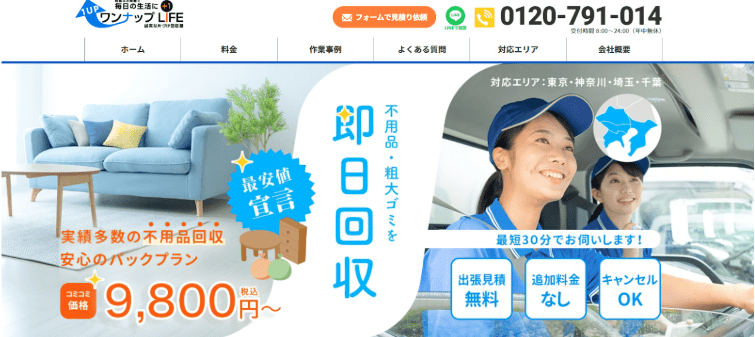 ワンナップLIFEは、東京・神奈川・千葉・埼玉を中心に、少量の不用品回収から大がかりな片付けまで相談できるサービスです。ゴミ屋敷清掃や引越しに伴う回収、事業ゴミ、遺品整理などにも対応しており、状況に合わせて依頼内容を組み立てやすい点が特長です。年間15,000件以上の実績があり、初めての方でも相談しやすい体制が整えられています。急ぎのときは当日申込み・即日対応が可能で、最短25分で到着できる体制や、早朝・深夜の作業にも対応できる柔軟さを掲げています。時間に追われる片付けほど不安が大きくなりがちですが、到着の目安が分かると気持ちを整えやすいです。