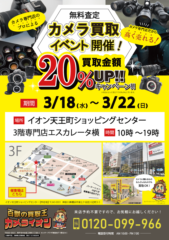 【カメラ買取 催事】イオン天王町ショッピングセンター 3/18 – 3/22