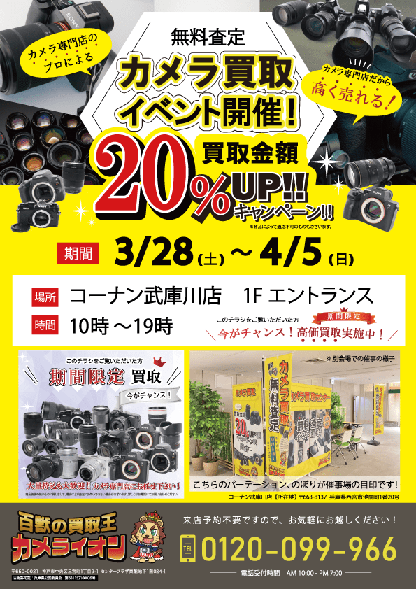 【カメラ買取 催事】コーナン武庫川店 3/28 – 4/5