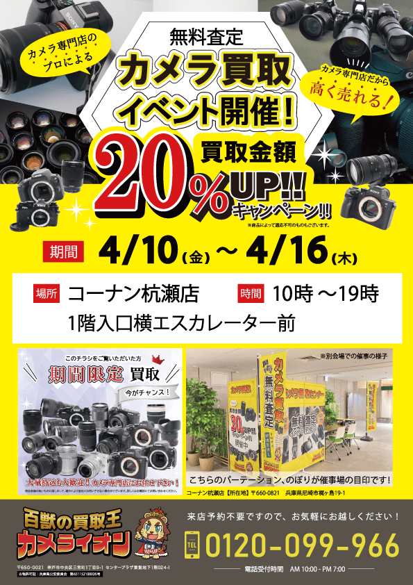 【カメラ買取 催事】コーナン杭瀬店 4/10 – 4/16